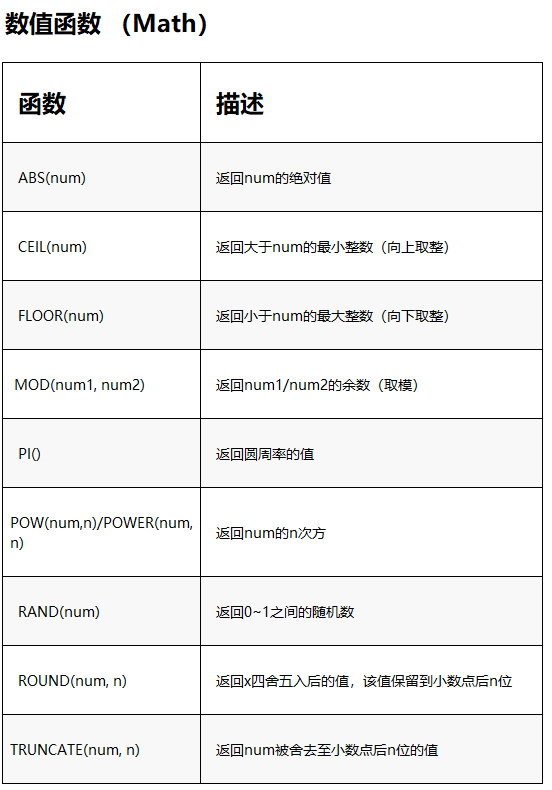 select abs(-5) 绝对值,ceil(5.3) 向上取整,floor(5.9) 向下取整,round(3.14) 四舍五入; -- 如果没有where条件的话,from dual可以省略不写
