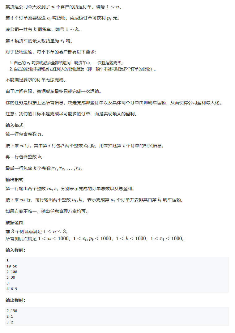 我们将货物按照利润从大到小进行排序,将车子按照载重从小到大进行排序,枚举车子,找到能够满足车子载重的最大利润的一个货物,这样下去就可以找到答案。