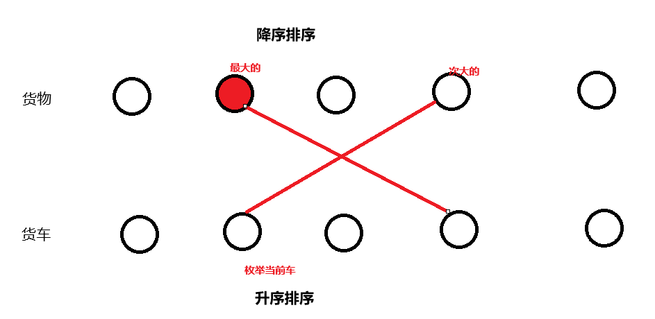 我们只需要证明交换两个车的货物,这个情况比上面的绝对不差就好。由于后面的货车载重大于前面的货车,所以我们前面也就是当前枚举的货车能载次大的货物,那么后面的也可以。我们交换之后不影响最终结果,所以得证。