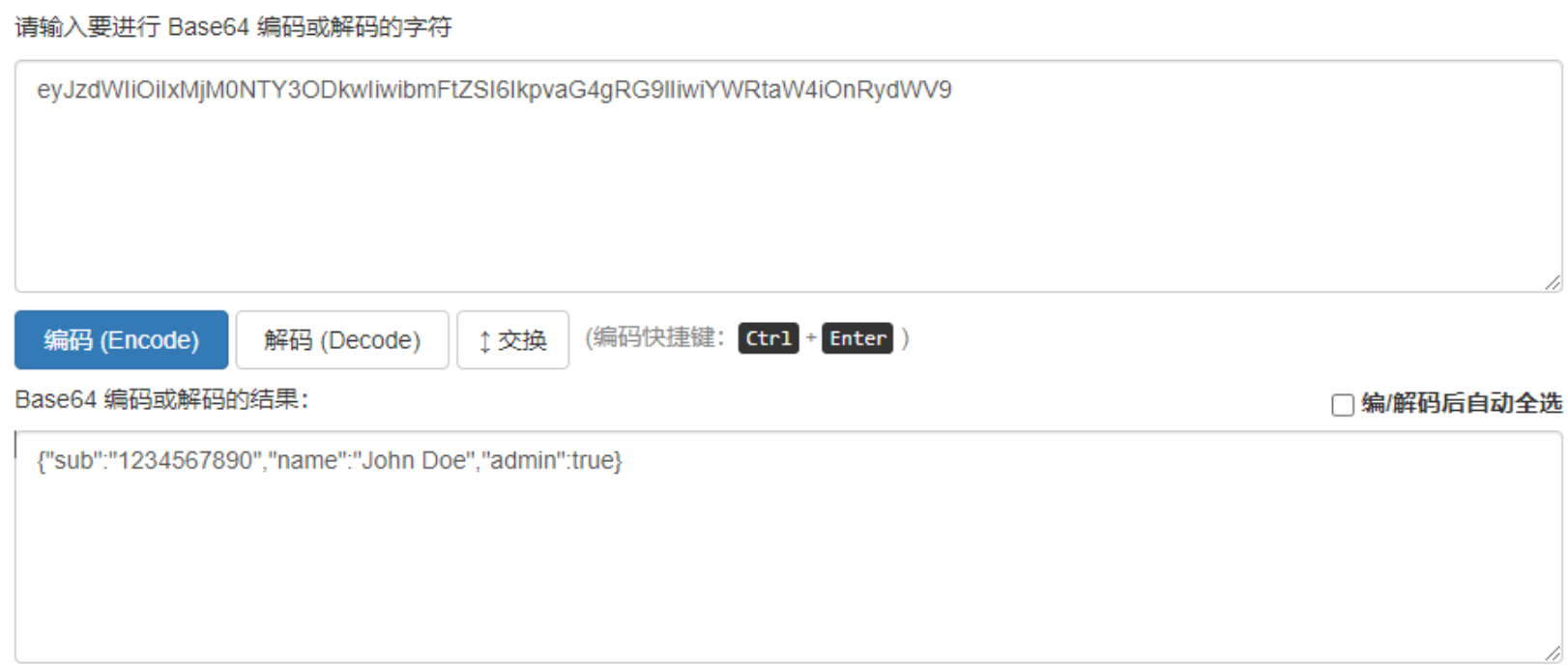 将上面的JSON数据进行base64编码,得到Jwt第二部分: eyJzdWIiOiIxMjM0NTY3ODkwIiwibmFtZSI6IkpvaG4gRG9lIiwiYWRtaW4iOnRydWV9