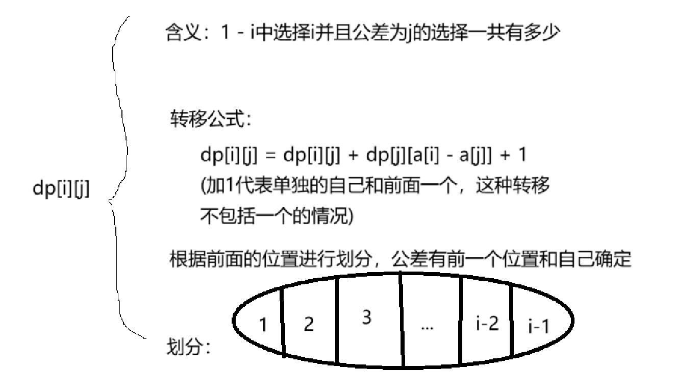 如果按照暴力来做我们是需要三层循环,第一层是1-n,第二层遍历公差,第三层遍历1-i。这样我们有O(n^3)会超时。当遍历公差的时候我们可以进行优化,我们发现当前位置的公差其实是由前面的任意一个数字和自己确定的,所以我们第二层公差可以遍历前面的所有数字。