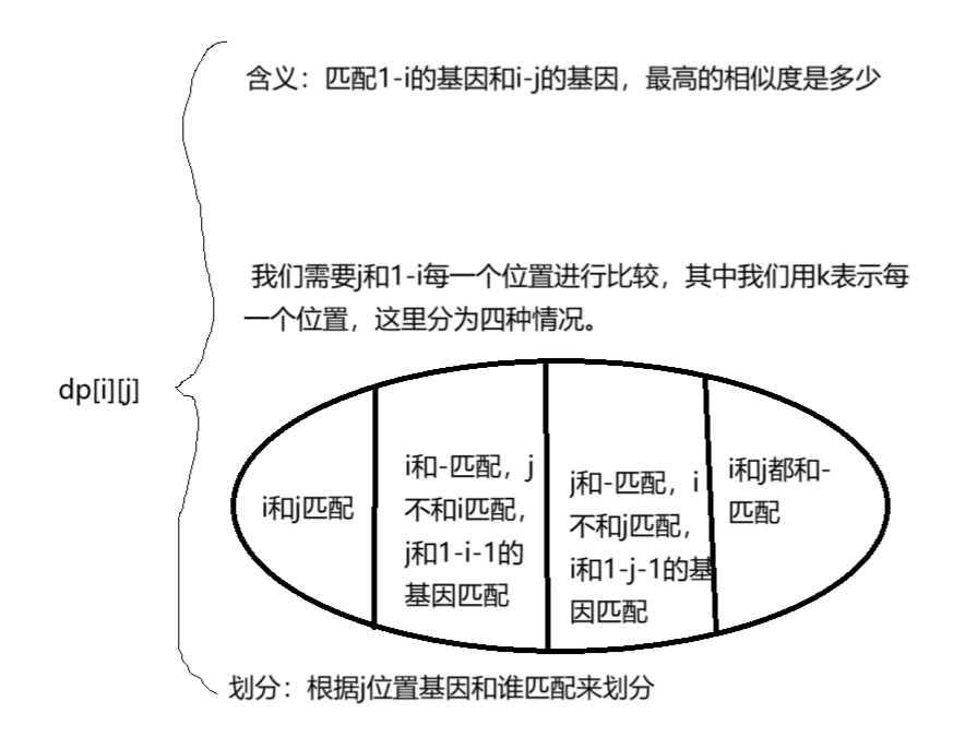 这个题目没想出来区间dp怎么解决,使用线性dp解决的。我们思路如下图,但是需要注意,我们初始化会存在dp[0] [j]和dp[i] [0]的情况,这个初始化其实就是-和剩下的相对应,我们可以处理一个a基因和b基因的对于-匹配的前缀和数组,方便计算。还有当我们k和j匹配了,还会剩下k+1 到i的基因要和-匹配,这个部分也可以通过前缀和数组计算出来。