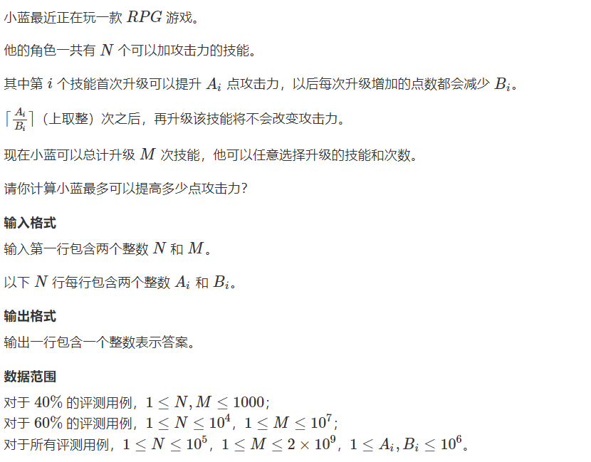 我们可以先把所有攻击力进行排序,从大到小的顺序。每当我们取出最大的技能之后,将这个技能减少b,在添加到队列当中。这样选出M个就是答案。但是这样会超时,最后的时间复杂度是MlogM