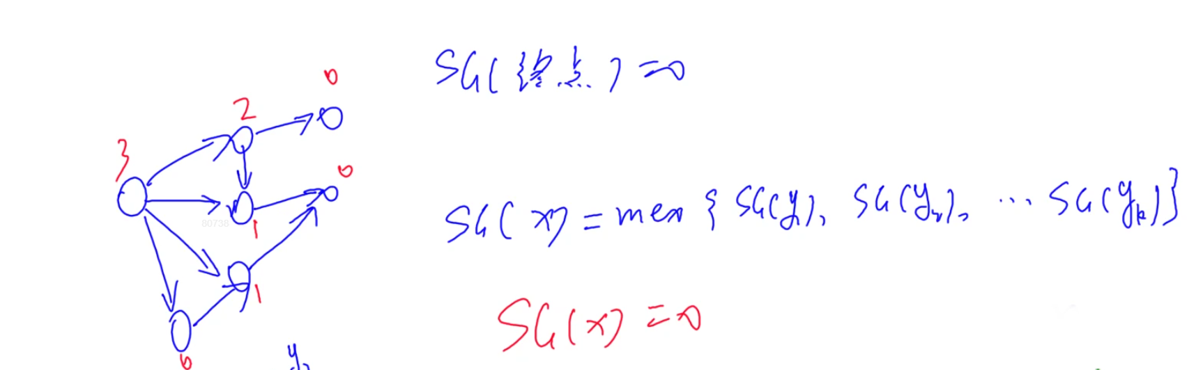 - sg函数:在博弈论中,每个状态都可以转化成别的状态,最后成为下面的图,我们定义没有出边的为必败态,sg(没有出边的点) = 0。每个点的sg值等于他指向所有节点sg值得mex运算。